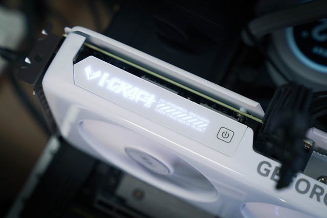 灯光方面,显卡侧面的Skylight RGB也进行了全新升级,预设了三种灯效模式,右侧配备灯光控制按键,支持RGB单色呼吸、长亮冰蓝、长亮雪白以及关闭灯光。不过通体可爱的显卡,在灯光控制按键这里略显正式了,或许换个小瑷珈头像更可爱一些。