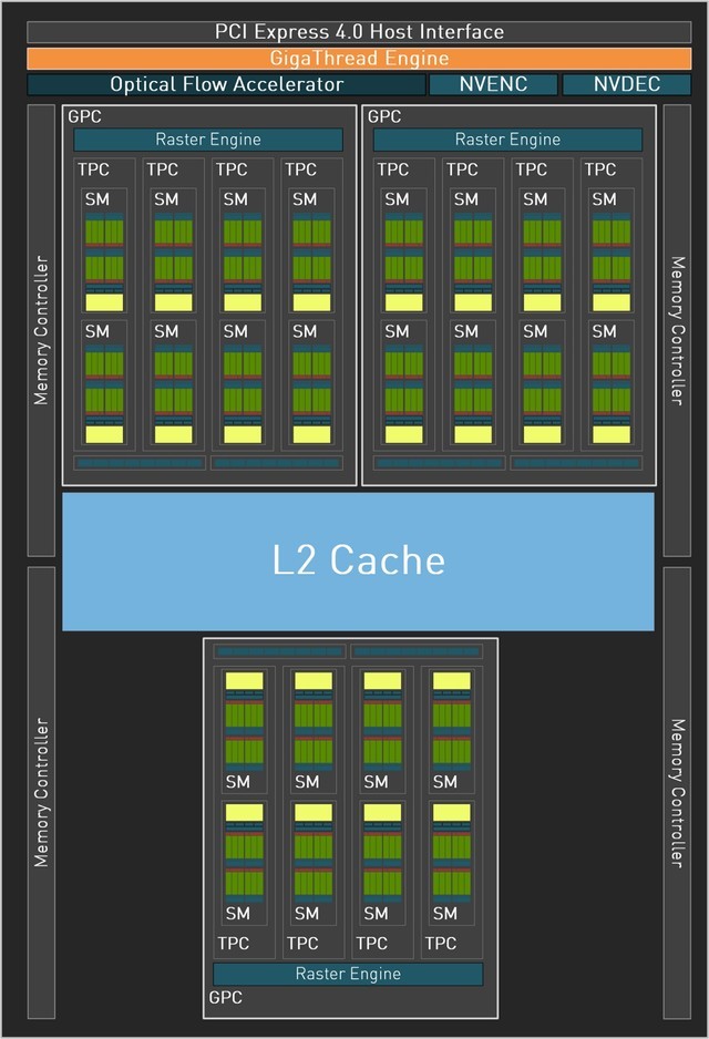 如果在L1缓存中找不到内核计算所需的数据,GPU将在L2数据缓存中寻找。这个显存系统位于GPU芯片上,并通过一个非常高速的横梁系统连接到所有的GPC(图形处理集群),每个GPC包括多个SM。如果在L2缓存中找到了信息,那么GPU就挑出这些数据并将其放入内核。