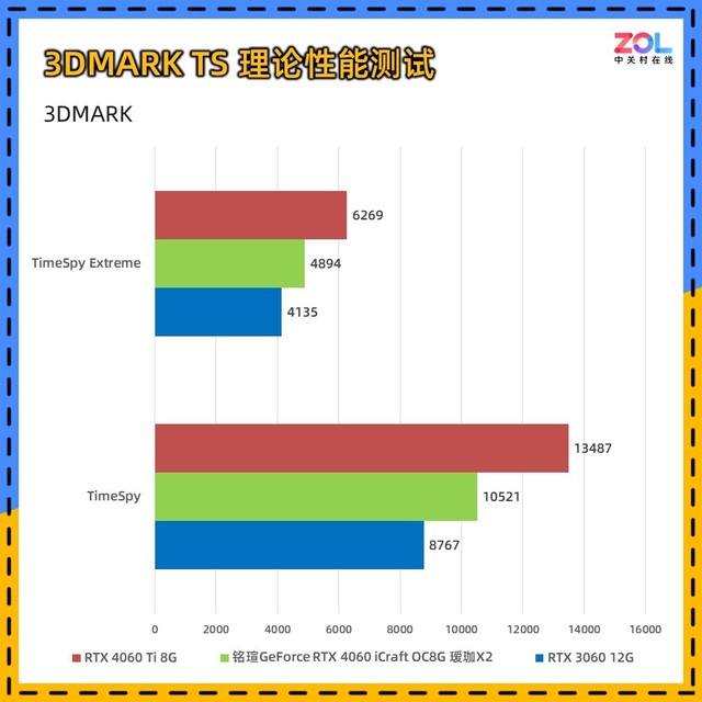 而在针对DX12环境下的Time Spy和Time Spy Extreme测试中,铭瑄 RTX4060 iCraft OC8G 瑷珈X2显卡相较RTX 3060的提升分别为:TS提升20%;TSE提升18%,综合约为19%。对比RTX4060 Ti,综合成绩相差23%左右。
