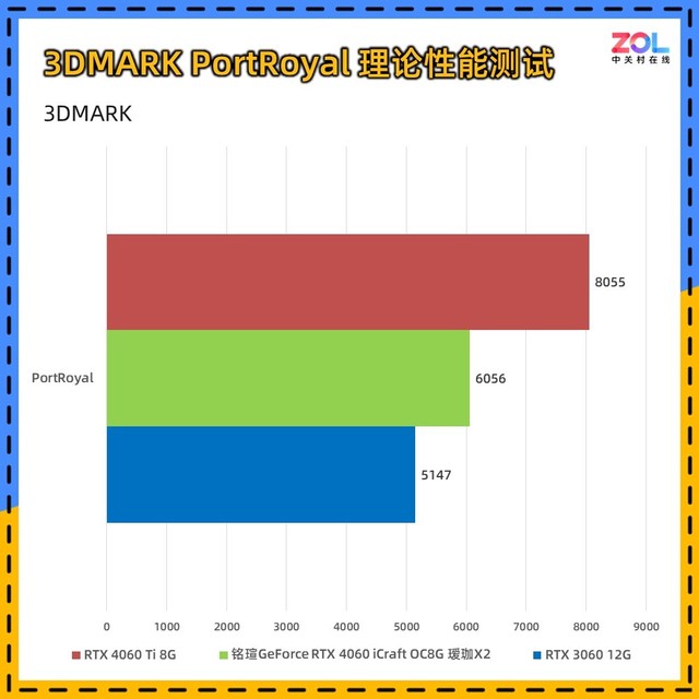 PortRoyal是3DMARK中专门针对光追性能的测试项,铭瑄 RTX4060 iCraft OC8G 瑷珈X2显卡相较RTX 3060的提升约为18%。对比RTX4060 Ti,相差25%左右。