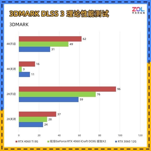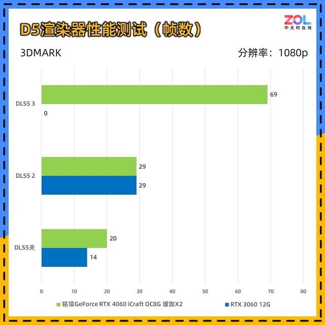另外我们使用3DMARK刚刚更新的DLSS 3进行了相关性能测试。不过由于RTX 3060无法开启,这里使用DLSS2进行对比测试。