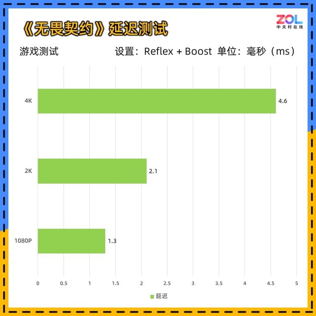 另外《无畏契约》游戏内提供了减少延迟技术,所有分辨率测试均开启Reflex + Boost选项,可以看到即便在4K分辨率下,延迟也仅有4.6ms左右。