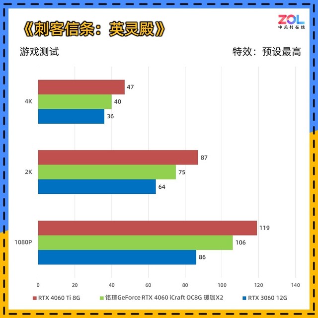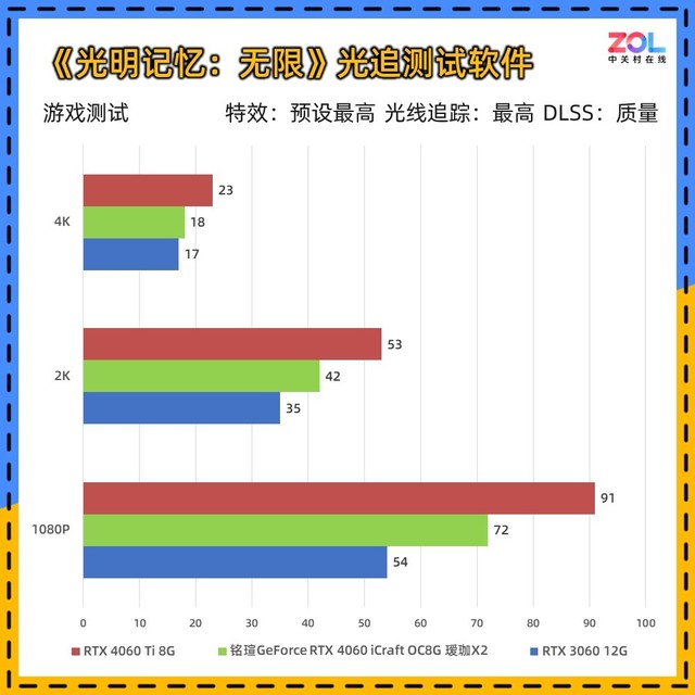 在《边境》中,铭瑄 RTX4060 iCraft OC8G 瑷珈X2显卡相比RTX 3060的提升分别为:1080p提升35%;2K提升27%;4K提升29%,综合提升30%。