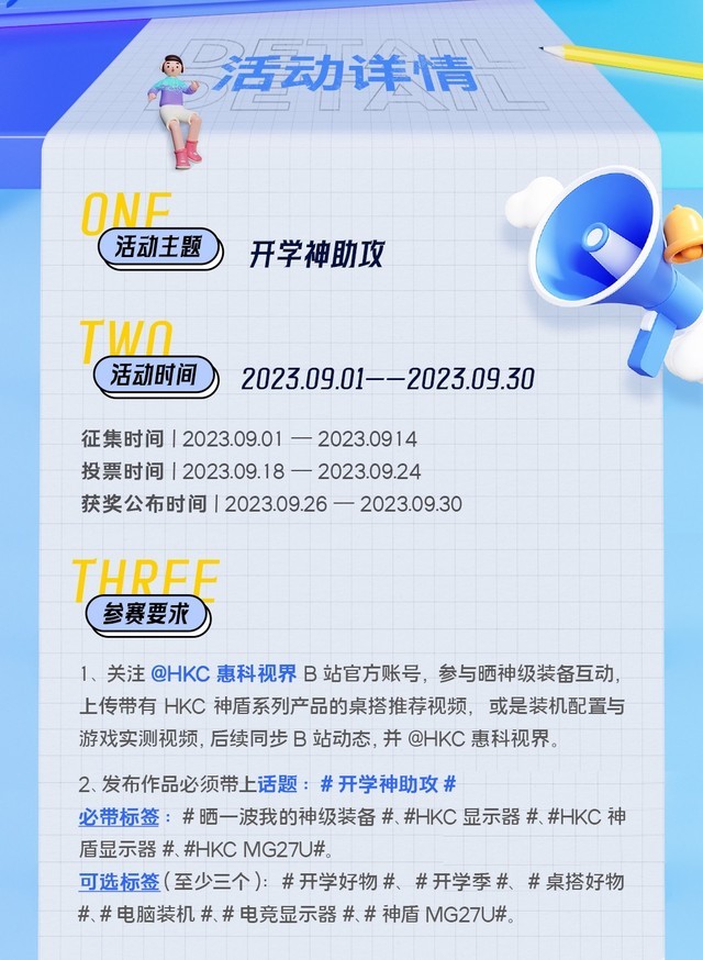 记得带上话题:#开学神助攻#,并且带上标签:#晒一波我的神级装备#、#HKC显示器#、#HKC神盾显示器#、#HKC MG27U#。也可以选择自己喜欢的个性标签,如#开学好物#、#开学季#、#桌搭好物#、#电脑装机#、#电竞显示器#、#神盾MG27U#等。