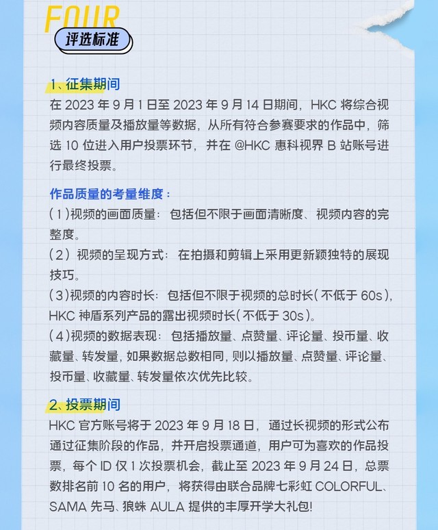 在9月1日至9月14日内容征集的期间,评委会综合视频内容质量及播放量等数据,从所有符合参赛要求的作品中,筛选10位进入用户投票环节,并在@HKC惠科视界B站账号进行最终投票。作品质量会综合画面质量、呈现方式、内容时长和数据表现进行考量,所以想脱颖而出的朋友就要多花心思了。9月18日至9月24日的投票期间,HKC会根据用户的实际投票结果,评选出一等奖、二等奖、三等奖和参与奖,每个ID仅一次投票机会哦~