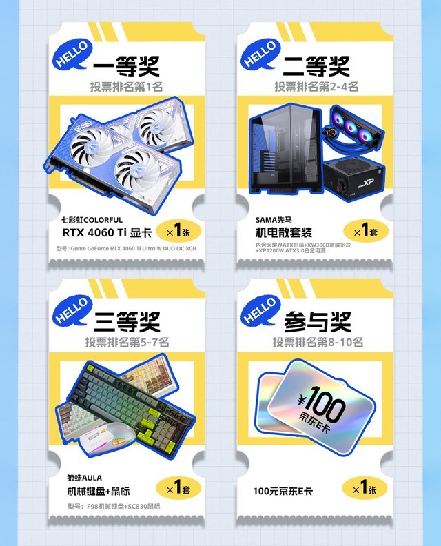 活动奖品包括七彩虹COLORFUL显卡、SAMA先马机电散套装、狼蛛AULA机械键盘和100元京东E卡。