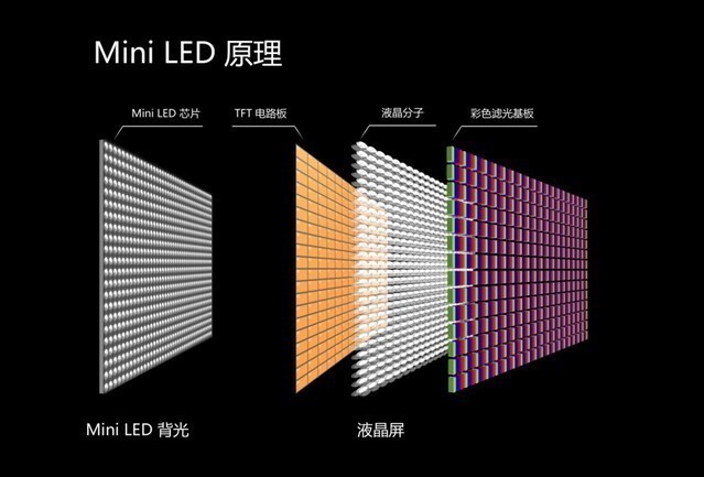 结合当前的市场需求,具有独特优势的MiniLED显示屏应运而生。这种屏幕用大量独立的微型LED元件取代了原始LCD的整个背光层。这些LED发光元件形成多个区域,每个区域的亮度都可以精细调节。与传统LED背光相比,MiniLED背光使用的LED芯片颗粒更小,显示效果更细腻,亮度更高。凭借自身的特点,可以做到黑更黑和白更白,同时具有优异的色准。