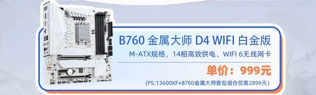 影驰B760金属大师D4WIFI白金版主板,M-ATX规格,支持12、13代酷睿处理器,双M.2接口均支持PCIE4.0,四个内存插槽可扩展128G,此外,还配有2个5VARGB和2个12VRGB接口,可以支持主板光效同步,目前购买13600KF套包只需2899元。