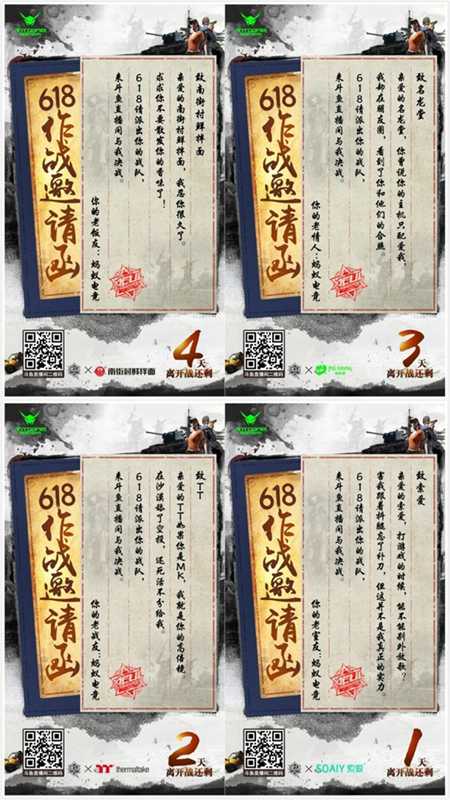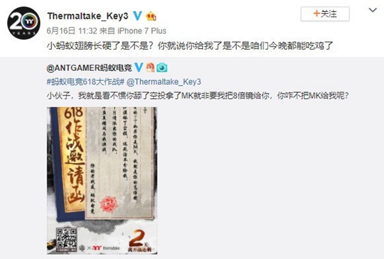 在618大作战来临之际,各家参与活动的品牌官微已经开始了调皮互动,ANTGAMER蚂蚁电竞在官方微博正式下达618作战邀请函,受邀的南街村鲜拌面、名龙堂、Tt、索爱品牌官微纷纷积极响应,表示战队已经集结完毕,期待当天与蚂蚁电竞一决雌雄!届时现场人气主播与ACUL参赛选手还会进行不同类型的线上趣味比赛近战武器赛、投掷物比赛、狙击枪赛各类型对决模式应有尽有,精彩赛事与丰厚好礼均同样不容错过!