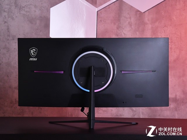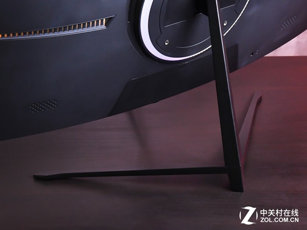 下面让我们来到显示器的背面,背面的设计也是充满了电竞元素,主体为黑色的哑光材质,我们还可以看到显示器的背面有一个非常有意思设计,那就是让人久久不能忘怀的环形氛围灯。