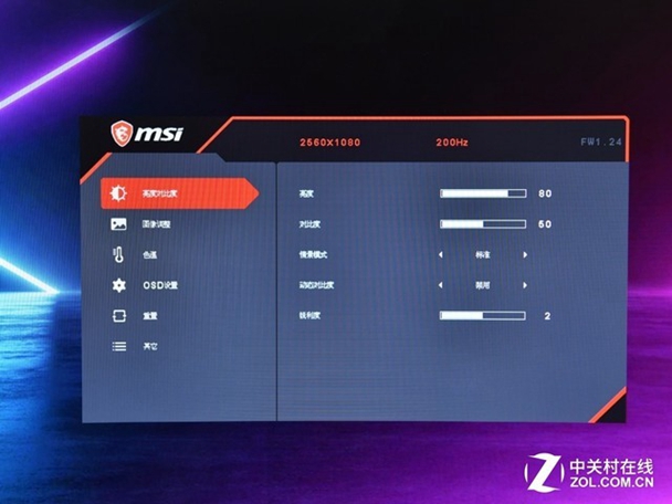 微星 PAG301CR显示器上有五个传统实体按键,我个人比较喜欢这种操控方式,因为实体按键会有清晰的反馈,对于用户来说还是比较好上手的,而且菜单逻辑也很容易掌握。接下来,我们来看一下显示器的OSD菜单选项。