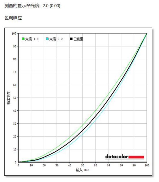 色调响应方面,已测量的黑色曲线应该尽量和浅蓝色的光度2.2曲线保持一致,可以看到实测的黑色曲线和光度2.2曲线还有一定差距,色调响应表现一般。