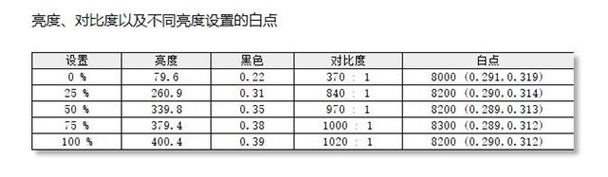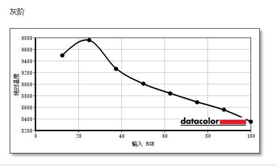 灰阶方面,显示器在40%-100%的亮度下呈下降趋势,基本是在9200K-8200K之间。