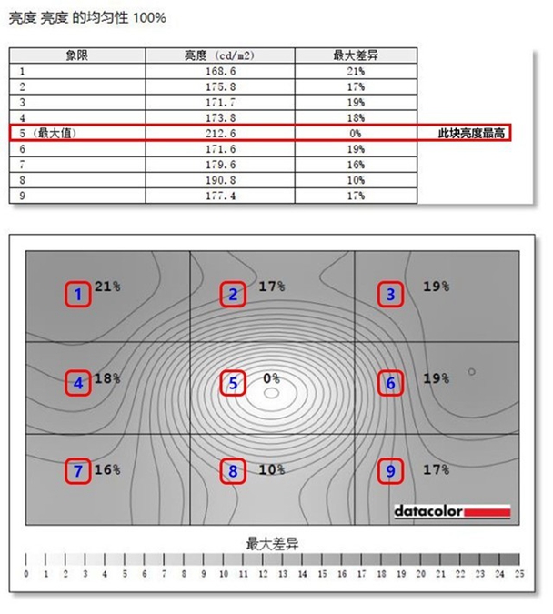 亮度均匀性测试中,飞利浦273V7QSB显示器最亮的地方在显示器中间的5号区域,为212.6cd/㎡,亮度差异最大的是1号,差异为21%。