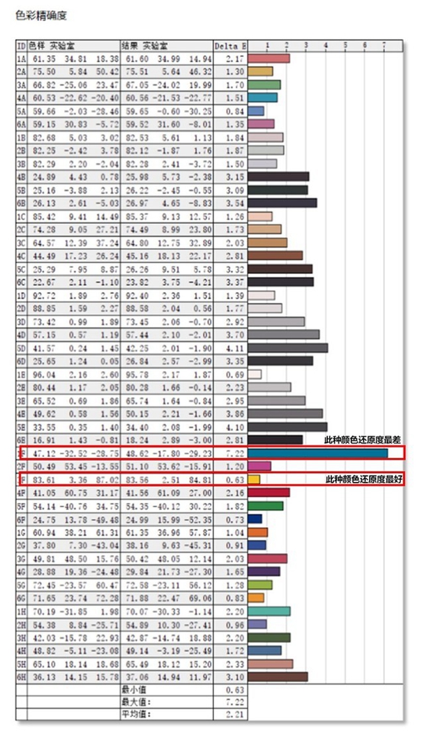 色彩精确度方面,显示器测试的48种颜色的平均△E值为2.21,最小值为0.63,最大值为7.22,当1<△E<3时,人眼需要比对后才能辨别细微的颜色差异,可见微星 PAG301CR显示器的色彩还原能力还是不错的。