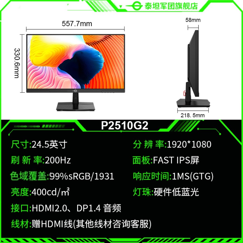 泰坦军团 P245MS ARMY24.5英寸 2K 240Hz QD量子点-MiniLED DC调光 HDR1000 升降旋转 FastIPS 1msGTG电竞显示器