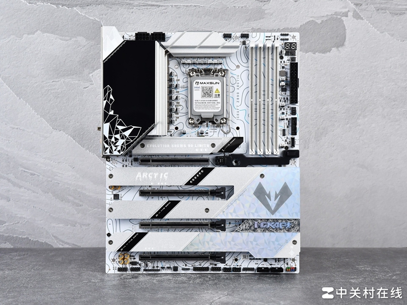 铭瑄瑄 Z890 Arctic主板在外观设计上令人眼前一亮,通体PCB和装甲几乎都是白色,透露出一种清新脱俗的美感,这款主板不是完全纯白设计,铭瑄在VRM散热盔甲上方特别配备了一块全新锐影屏,支持RGB光效和自定义图案信息。而这种黑与白的巧妙,突出了冰原冰川下的深邃与神秘,散热装甲表面纹理细节也明显是精心打造,展现如冰裂纹般的细腻纹理,看一眼就仿佛让人带入到那片极地世界之中。
