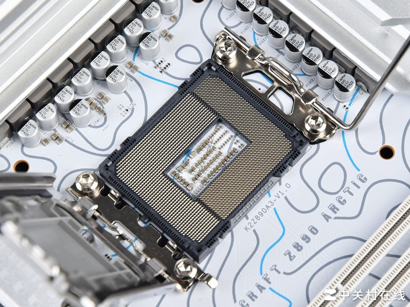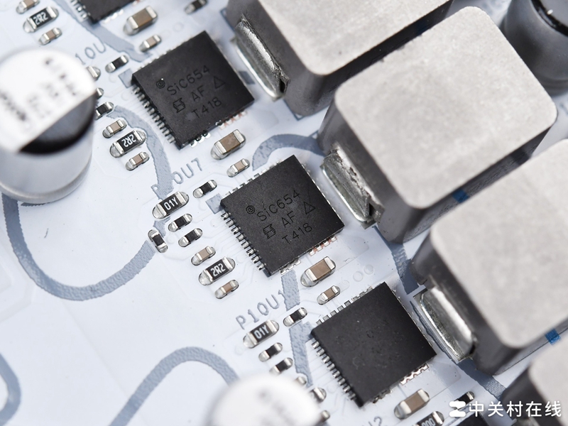 供电方面,铭瑄瑄 Z890 Arctic主板配备16+1+1相,比传统多了一相VNNAON,是目前酷睿Ultra 200S平台独有的。核心16相采用了DrMos设计,型号为SIC654,PEM控制器型号为RT3628AE。这套供电系统对于能耗比增强的酷睿Ultra 200S系列处理器完全够用,旗舰Ultra 9 285K也不在话下。