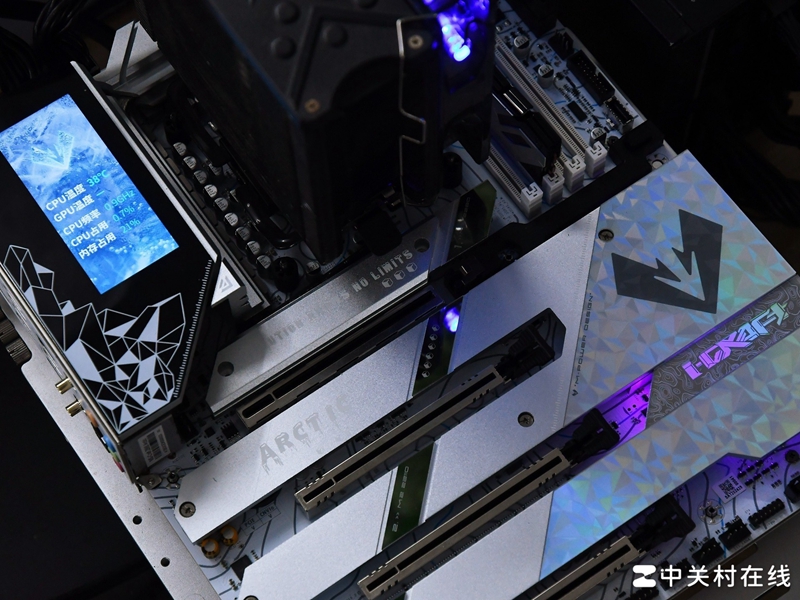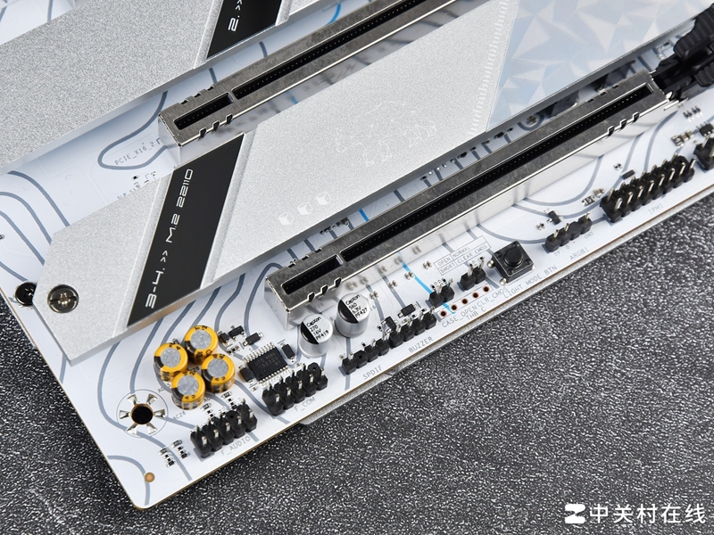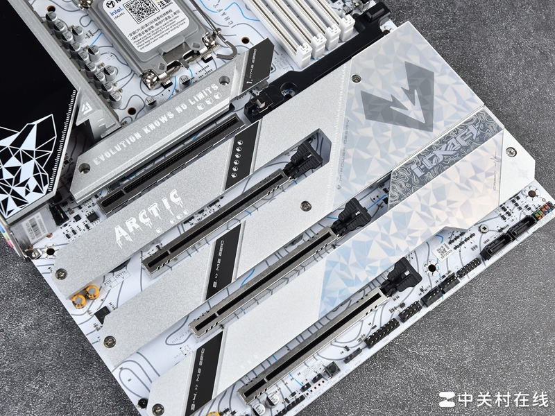 拓展上先来看看PCIe插槽,铭瑄瑄 Z890 Arctic主板总共配备4根PCIe全尺寸插槽,这在顶级主板中也比较少见,其中A和C槽分别为PCIe5.0x16(可拆分)。可拆分成PCIe 5.0x8或者PCIe 5.0x4+x4(需拆分,不然是空槽),B和D槽则是PCIe 4.0 x4。