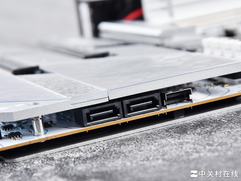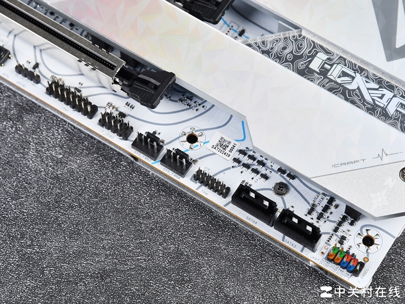 除了4组M.2插槽,铭瑄瑄 Z890 Arctic主板还板载4组SATA插槽,在拓展方面完全够用了。旁边还有一个SFF-8654 4i拓展接口,可用于拓展PCIe4.0以及SATA和U.2接口,非常少见。