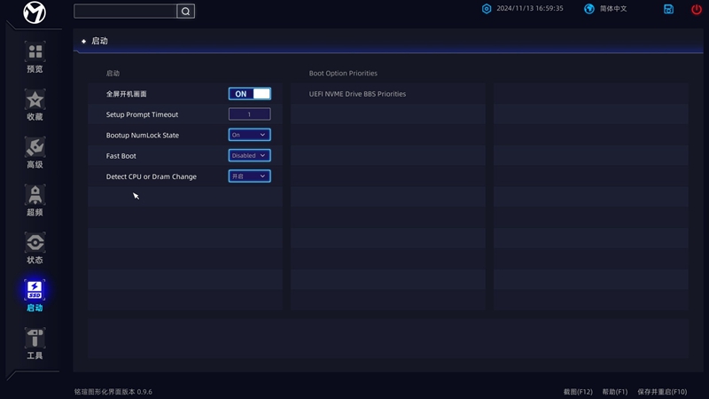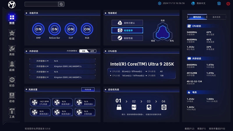 首先来到铭瑄这套图形化UEFI界面的主菜单,支持中文调节。在主菜单可以简单调整XMP、性能模式以及风扇这些常用进阶设置功能,同时查看硬件信息。而且如果你接线错误铭瑄的BIOS还会有提示。