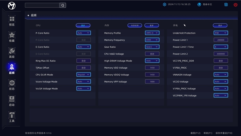 接着来到OC超频界面,铭瑄将CPU、内存以及电压三个重要设置整合在这个界面中,当然可以通过子项中的更多选项调节一些细节设置。