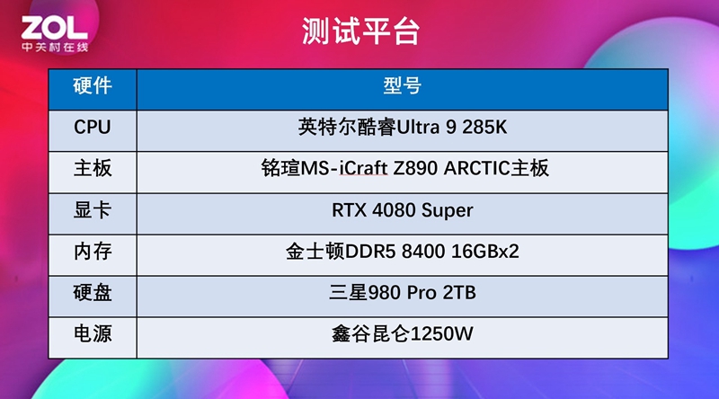 此次测试我们使用了酷睿Ultra 200S旗舰型号酷睿Ultra 9 285K,这款处理器24核24线程设计,睿频加速最高为5.7GHz,三级缓存36MB,基础功耗125W,最高功耗250W。这代英特尔虽然依旧是性能混合架构设计,但没有采用超线程,像酷睿Ultra 9 285K就是8P+16E,所以对比上一代核心线程有所减少。不过特点是功耗降低,发热减少,所以在平台稳定性上以及实际性能表现上反而要更强一些。