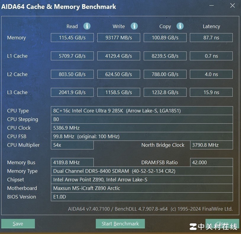 我们先来测试一下铭瑄瑄 Z890 Arctic主板对于高频内存的支持,我们手里这套内存支持XMP 8400MT/s,在这款主板开启没有任何压力,先看下XMP 8400 MT/s内存的性能表现。