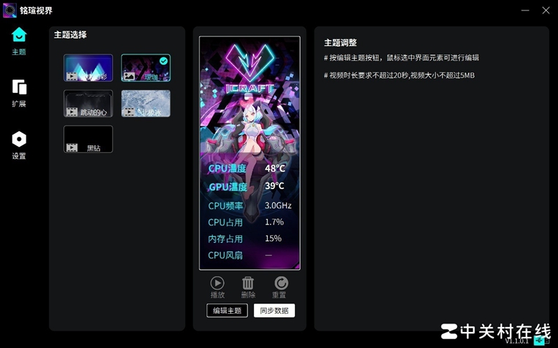 最后再简单介绍一下铭瑄视界这款软件,这是铭瑄基于自家锐影屏设计的软件,可以让用户自定义设置,具备多种个性化玩法,主题界面就有5种预设风格选择,可以实时显示硬件运行信息。