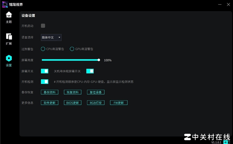 设置界面调整亮度、语言等参数,铭瑄还在此提供了备份功能选项,主要考虑到一些用户会更新系统软件,备份就不用再重新调整了,跟前面BIOS超频预设档位有异曲同工之妙。
