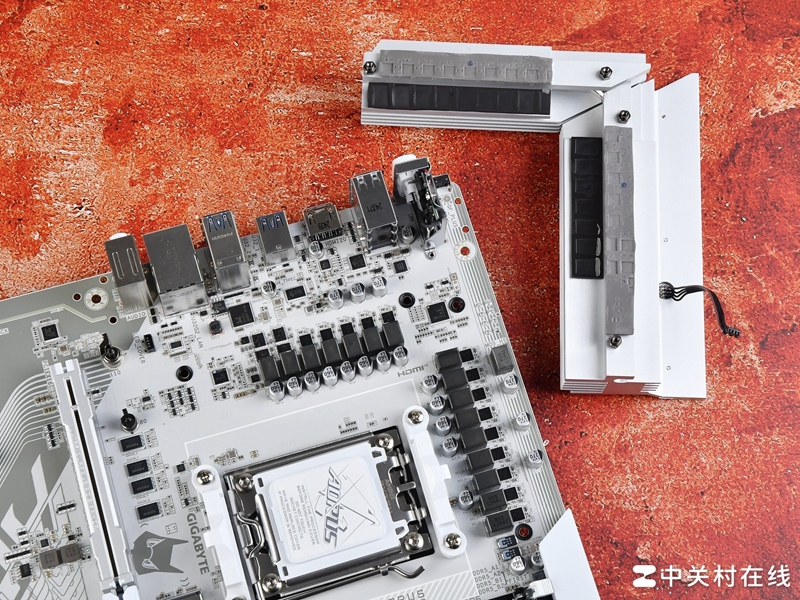 技嘉 B650E 冰雕背插版的散热装甲采用一体化设计,由一根6mm复合热管连接两个散热片,规模更加庞大,正面采用鳍片式设计提高进风量,底部增加导热垫快速传到MOS热量。