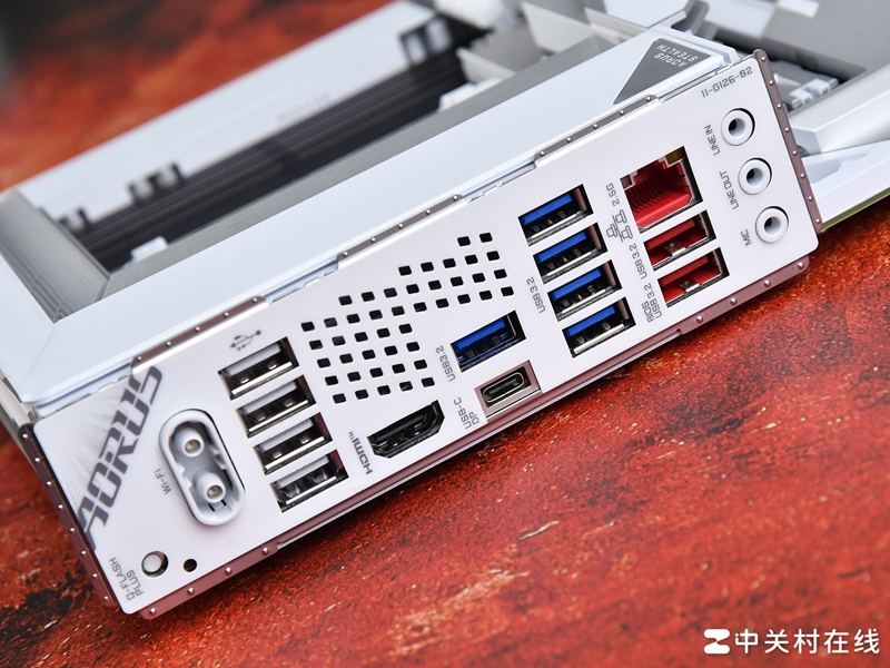 I/O区域,这款主板提供4个USB 2.0接口,5个USB 3.2Gen 1 Type-A(5Gbps)接口,2个USB 3.2 Gen 2 Type-A(10Gbps),还有一个全功能USB 3.2 Gen 2 Type-C(40Gbps)接口,支持DP-Alt,这也是为啥这款主板I/O区域只有一个HDMI的原因。
