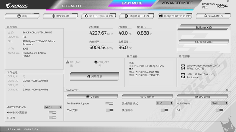 技嘉 B650E 冰雕背插版主板与常规冰雕系列一样,都是定制化UEFI设计,纯白风格界面,主要分为EASY MODE和ADVANCED MODE两种模式,EASY MODE就是主菜单,集成常用基础功能,比如硬件信息查看、XMO/EXPO开启、X3D Turbo开启、Q-Flash等功能开启等都可以在此页面找到,不过要进行深度的调节还得进入ADVANCED MODE。