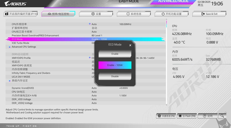 左边就是重要的超频界面,首先可以看到基于AMD处理器独有的超频设置,比如PBO一键超频、105W功耗解锁以及X3D游戏加速等功能。不过对于这两代AMD锐龙7000和锐龙9000来说,超频空间很小,好处是不用向隔壁那么折腾,适合平民玩家一键上手。