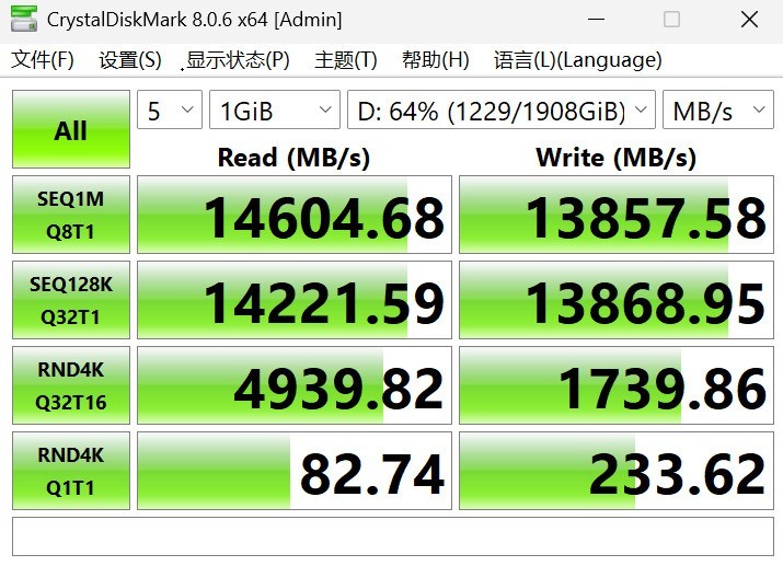 我们写入了一半多容量的PCIe5.0固态,最终读取速度达到14604.58MB/s,写入速度达到13857.58MB/s,表现出了PCIe 5.0固态应有的水平,说明这套技嘉 B650E 冰雕背插版主板平台应对未来越来越多的PCIe 5.0生态也不在话下。