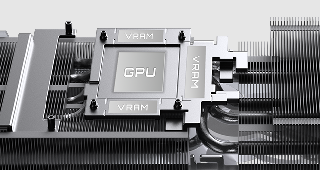 风扇下面是大面积的散热鳍片,以及大尺寸铜板和复合式热管。大尺寸铜板可以与显卡核心充分接触,将热量快速导出。同时显存和供电部分均采用服务器级导热凝胶作为导热介质,导热能力更强,也更耐用。而且背面采用鳍片透吹设计,进一步提高散热能力。