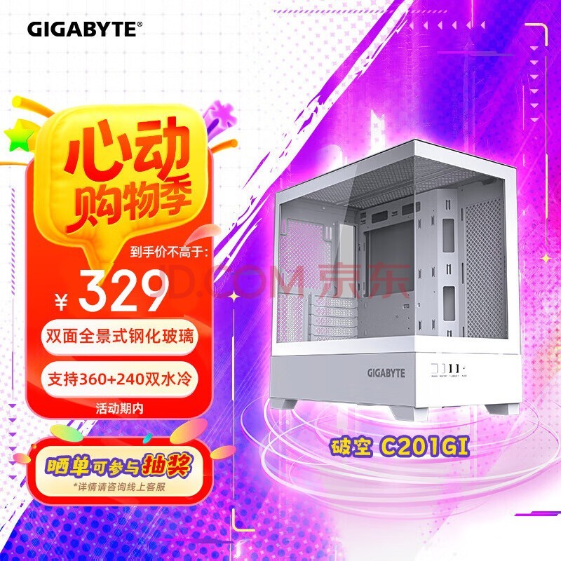 推荐完了核心硬件,我们再来看看机箱。为了满足玩家对于纯白海景房的需求,技嘉推出了破空C201GI全景式机箱,纯白配色可为海景房玩家提供最有解。在技嘉京东自营旗舰店中,优惠到手价329元。