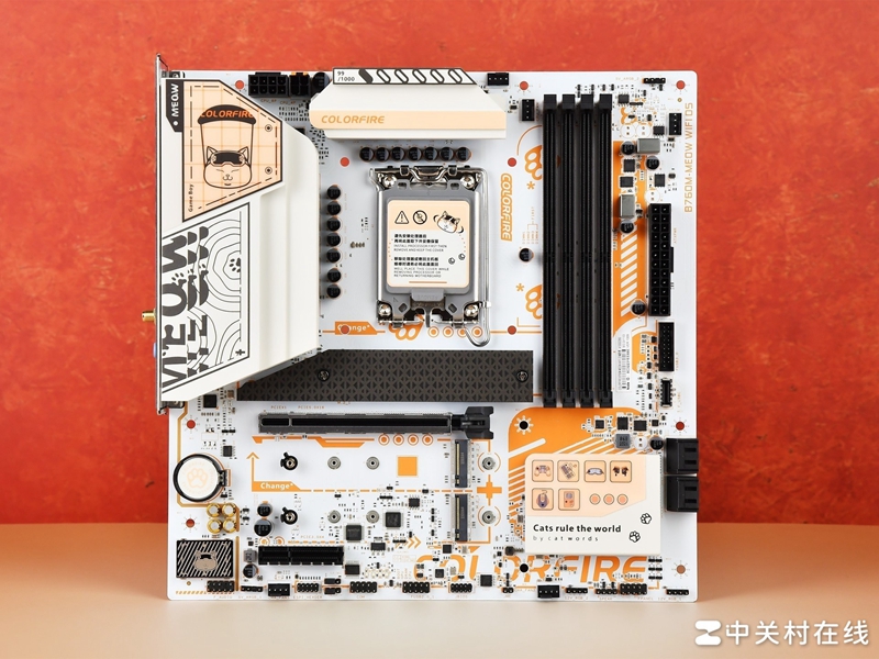 CPU插槽方面,作为B760芯片组,七彩虹 B760M-MEOW WIFI D5 橘影橙主板使用了LGA 1700插槽,能够兼容所有12/13/14代酷睿处理器。
