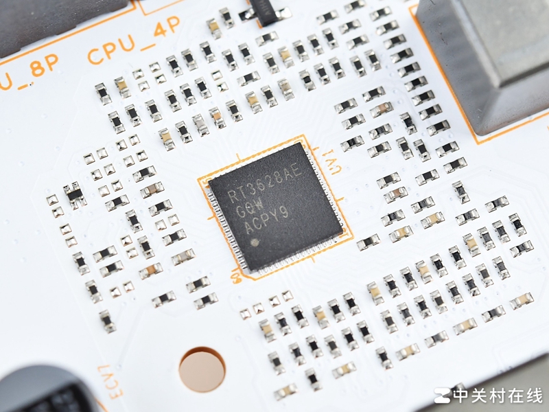 供电上,七彩虹 B760M-MEOW WIFI D5 橘影橙主板有了明显升级,另一款定位更低的COLORFIRE B760M-A MEOW橘宝主板只有6相,因此不能搭配过于高端的处理器。而这款七彩虹 B760M-MEOW WIFI D5 橘影橙主板这次直接提供了12+1+1相供电模组,PWM控制器为RT3628AE,核心12相供电采用55A的DrMos设计,型号应该是来自Alpha & Omega的AOZ5516QI。