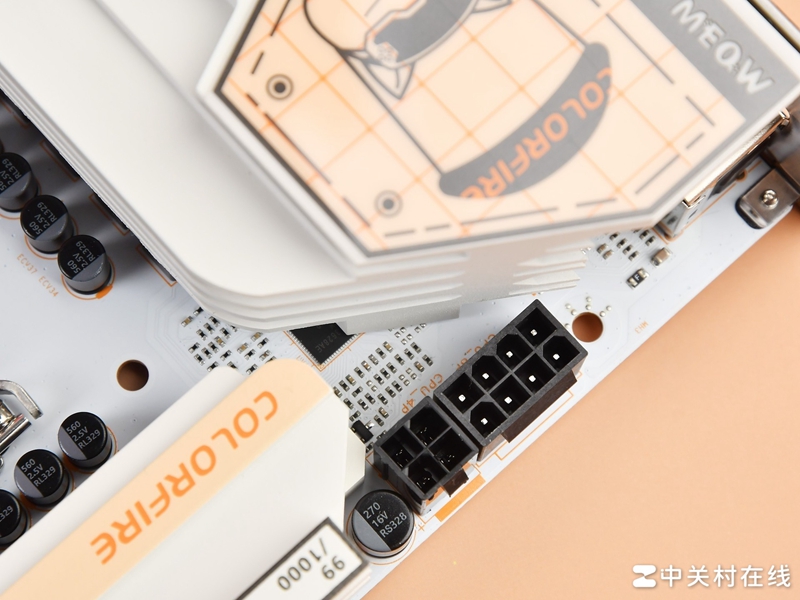 七彩虹 B760M-MEOW WIFI D5 橘影橙主板供电上面的散热装甲也不只是拥有萌宠元素的装饰,而是实打实的两款金属散热片,底部也配备导热垫,可以高效传递MOS管热量,保证高端处理器稳定运行。