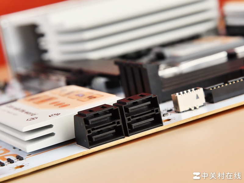 七彩虹 B760M-MEOW WIFI D5 橘影橙主板右侧提供了4个SATA,支持有磁盘阵列需求的用户进行组建。