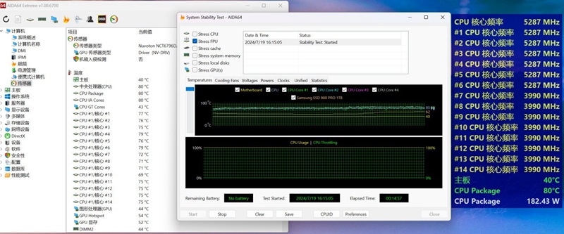 上图是开启104微码后的拷机表现,我们散热器为240mm水冷,而在压力最大的FPU单拷中,在七彩虹 B760M-MEOW WIFI D5 橘影橙主板上可以将酷睿i5-14600K压在80℃,并且大小核心均跑满了睿频。功耗方面图上显示是182W左右,但实际会在160w-190W之间波动,就此功耗而言,百元风冷也压的住。而我们之前也测试了不开启104微码直接FPU单拷的情况,不开启104微码即使240mm水冷也压不住,刚拷机就会小幅降频,大概2分钟CPU温度就到100℃了,根本压不住。可见104微码的重要性,而且我们这次还没有进行降压,如果进行降压,温度应该还能进一步降低。