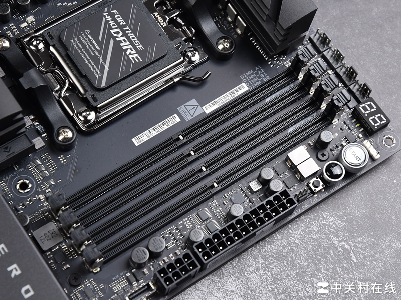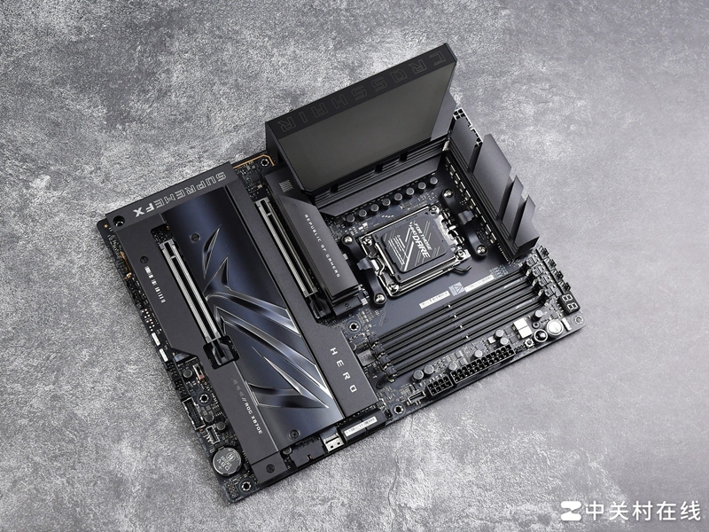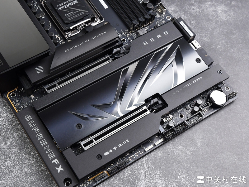 HERO作为纯血ROG玩家国度主板中的入门型号,华硕 X870E HERO主板ROG浓度简直拉满,败家之眼LOGO一眼入境,当然整体风格对比上代简洁了不少,整个板子突出一种模块化的的感觉,方正到位的同时又被ROG的各方面元素拔高了电竞效果。