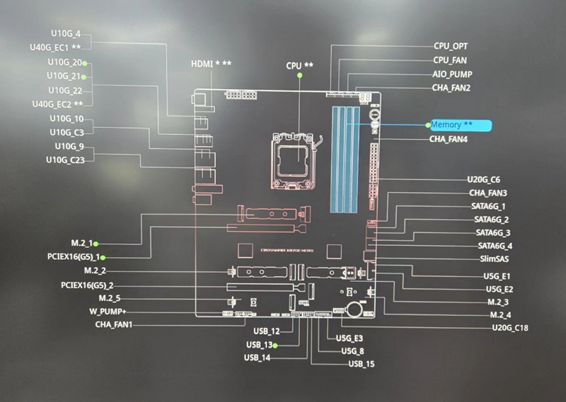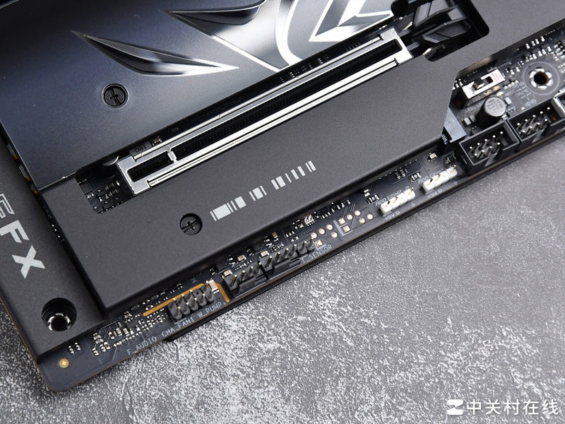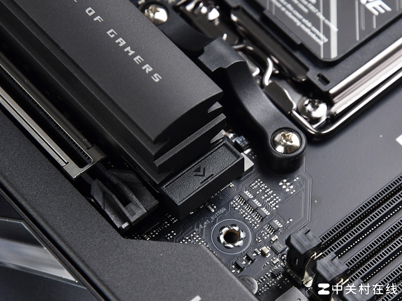 这5组M.2插槽均支持快拆设计,同时顶部的M.2 1槽不仅装备了最厚实的散热装甲,这个散热装甲也支持免螺丝拆装,轻轻一按即可拆装散热装甲。