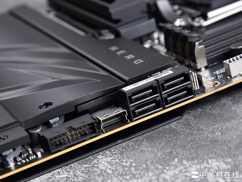 侧插式SATA接口总共有4个,位于常规位置,旁边提供一个USB 3.2 Gen2x2 TYPE-C前置接口和USB 3.2 Gen1 TYPE-A前置接口。