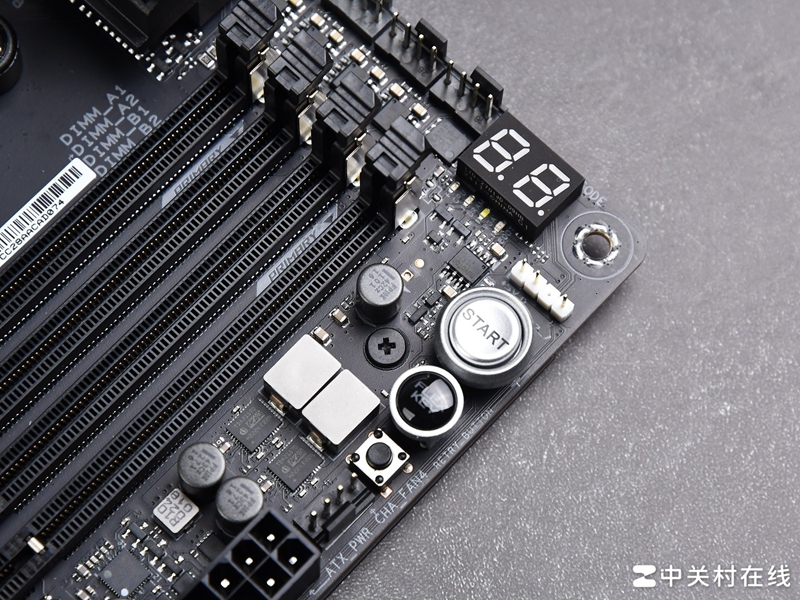 这款主板顶部提供DIY快捷开机和重启按钮,同时自带Debug自检灯和数字显示屏,方便快速排查硬件故障。
