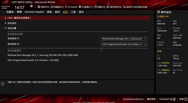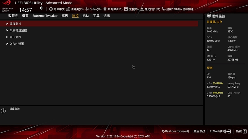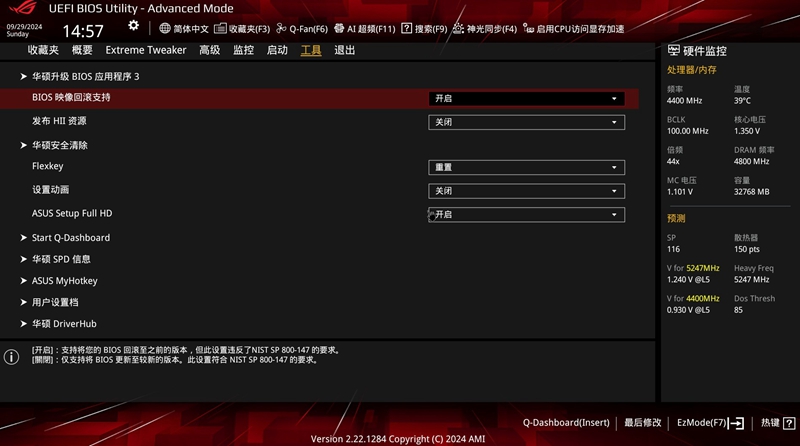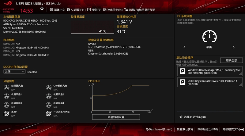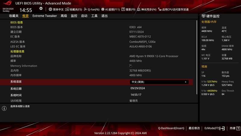 下面我们来看一下华硕 X870E HERO主板的BIOS设计,纯血ROG玩家国度主板的UEFI界面大家应该也很熟悉了,华硕的BIOS讲究也是一个操作流畅功能全面,首先进入的是EZMODE主菜单界面,这个菜单集成了主板重要功能,并且提供一键设置。