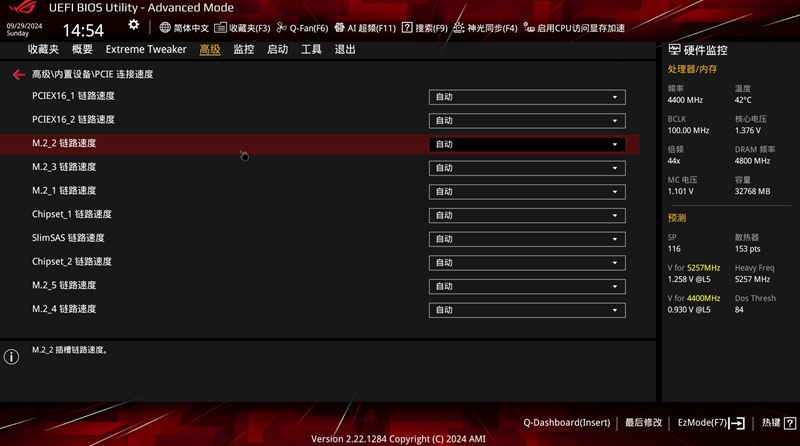这次华硕在BIOS中加入了Q-Dashbord便捷仪表盘的一个设置选项,位于主板下方,主菜单就能看到,不过不知道为啥截图不成功。这个选项进入后可以看到主板点位图,点击需要设置的点位,即可直接进入设置选项,比如我们选择M.2后,就这直接调到了M.2链路设置界面,以往要进入这项设置,还需要在高级菜单中往下找两三个层级才能周到,这其实对于一些新手用户来说非常困难,而华硕的仪表盘设计,极大节省了大家找设置选项的时间。
