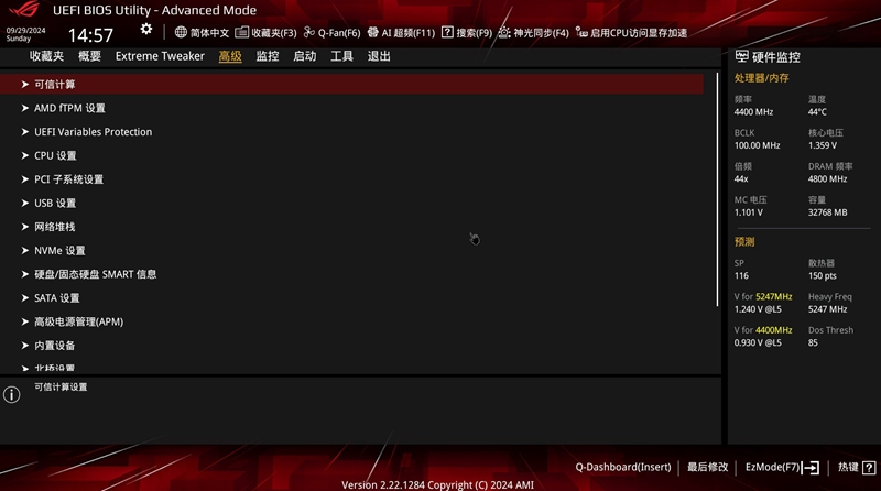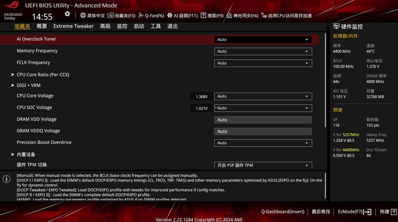 接下来按F7可以进入进阶设置压面,首先是收藏夹会收录常用功能设置,而华硕 X870E HERO主板的默认设置选项也比之前要多一些。