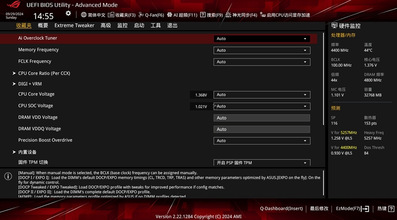 接下来则是重量级的要Extreme Tweaker界面,可以说是华硕主板最重要的设置项目,集成大量超频相关选项,最顶部的序列主要用来调整DOCP以及华硕AI智能超频设置选项,还有AEMP这种专门给没有预设模块效率条准备的意见超频功能,经典的AI Optimized,也可以在这个界面中的CPU Core Ratio设置中找到,开启后即可实现一键超频,提升性能,同时对于深度超频用户也会通过AI算法给出超频意见。
